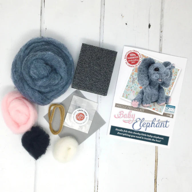 Your Baby Elephant Needle Felting Craft Kit contains: 100% Corriedale wool, top quality German felting needles, pipe cleaner, a recycled foam mat to work on, wool-mix felt fabric, glass eyes, full colour instructions.