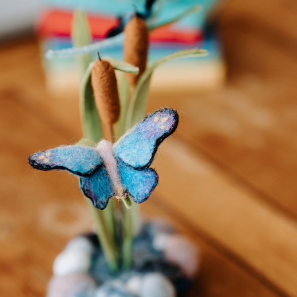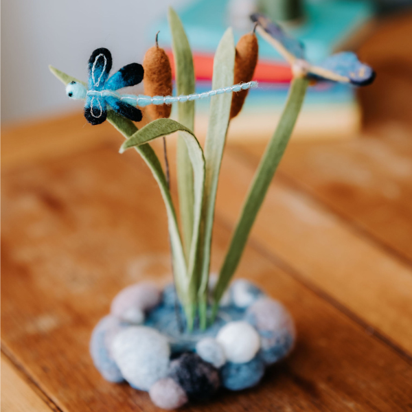 The Crafty Kit's Company's needle felting craft kit contains everything you need to needle felt your own Peaceful Pond. Such an idyllic scene featuring delicate dragonflies and butterflies, and very realistic cattails!
